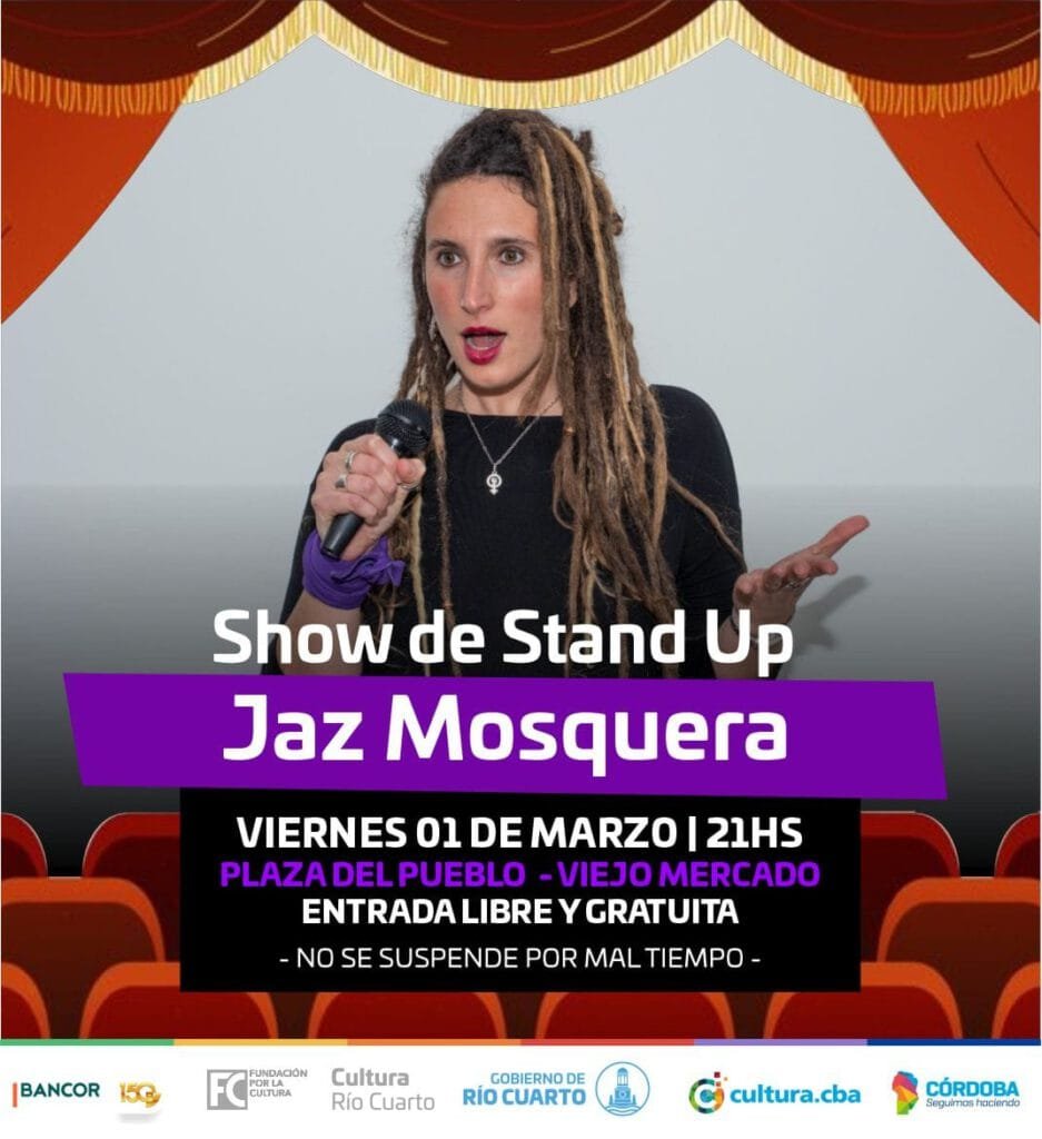 Este viernes 1º de marzo a las 21hs. en la Plaza del Pueblo-Viejo Mercado, se presenta el show de Stand Up a cargo de Jaz Mosquera, contando material nuevo y los clásicos de su unipersonal. No se suspende por mal tiempo.